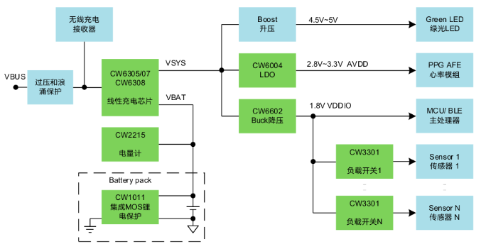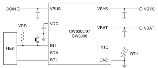 CW6305/6307功能与CW6308一致,区别是可支持最大470mA充电电流,芯片封装尺寸为WLCSP-9,1.55mm*1.55mm。