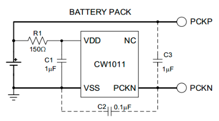 CW1011为单节锂电池保护芯片,支持高精度过压、欠压、充电过流、放电过流和短路保护。芯片内部集成了54mΩ导通电阻的Dual MOSFETs;其静态工作电流为2.5μA,并支持休眠模式,功耗低至20nA。CW1011的封装为DFN-6,尺寸为2.0mm*1.5mm。